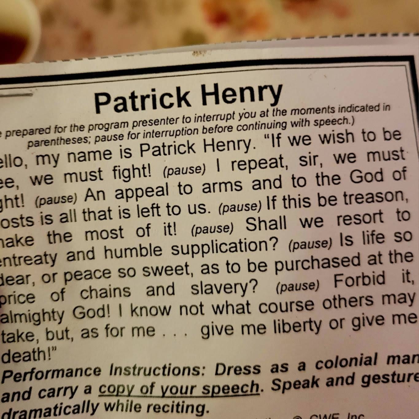 I’ve been helping one of my kids prepare for an event called “Walk Through The American Revolution,” where he role-plays Patrick Henry.